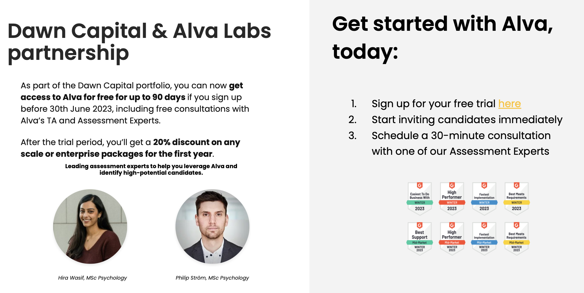 Alva is a candidate assessment solution that provides recruiters and hiring teams with the insights to make more confidentand efficient decisions in all stages of the hiring process while delivering a high-quality candidate experience.